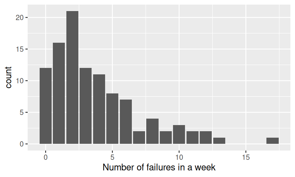 To explore the distribution of a single discrete variable, we can use a bar plot. For example, we can plot the weekly counts of computer failures from Example 1.2: