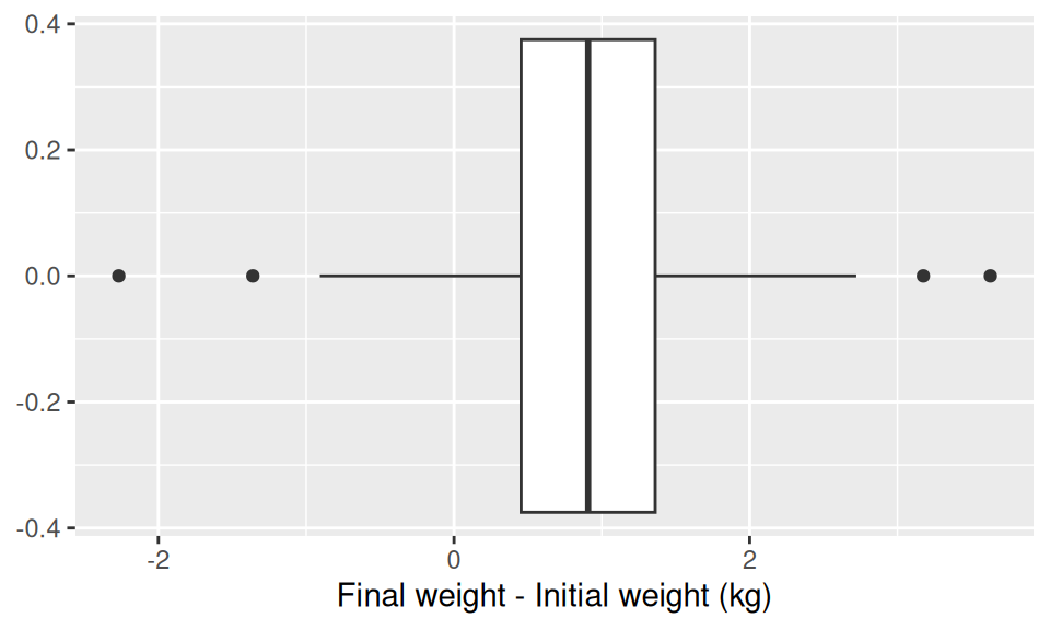We can use a box-and-whiskers plot to summarise the distribution of the weight difference:
