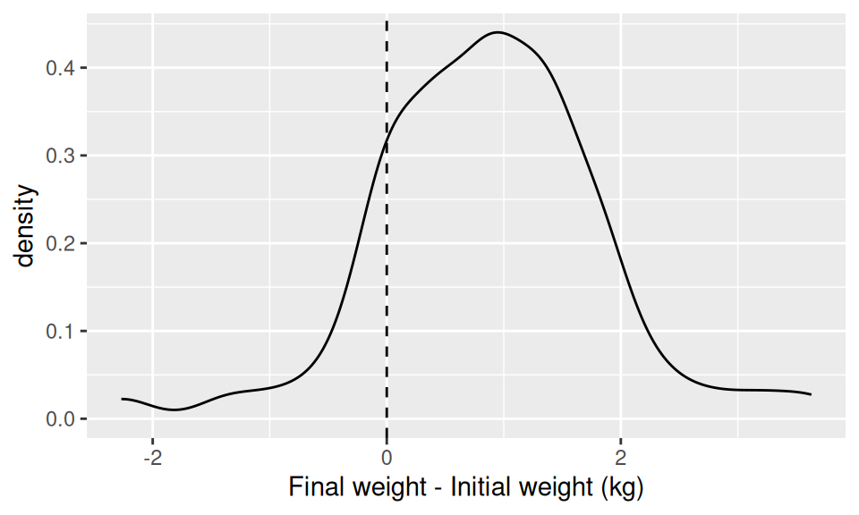 There are several types of plots we can use to summarise the shape of a single continuous variable’s distribution. For example, suppose we are interested in the weight gain in Example 1.3.