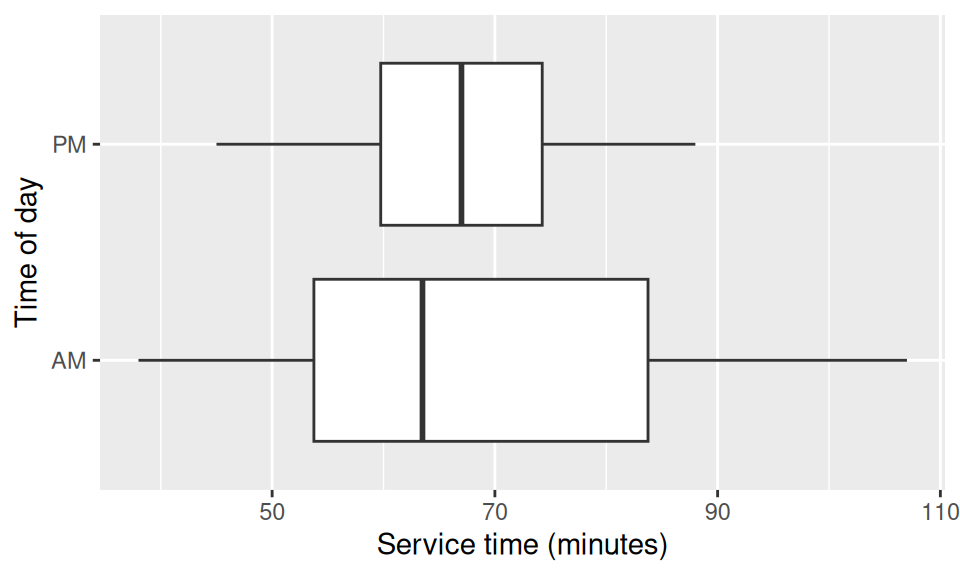 We can also use a box-and-whiskers plot to show how a continuous variable changes with a discrete one. For example, for the service time data from Example 1.1, we are interested in how AM and PM service times compare: