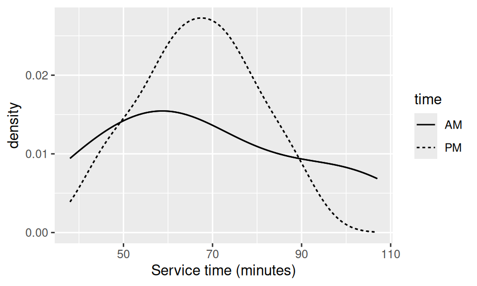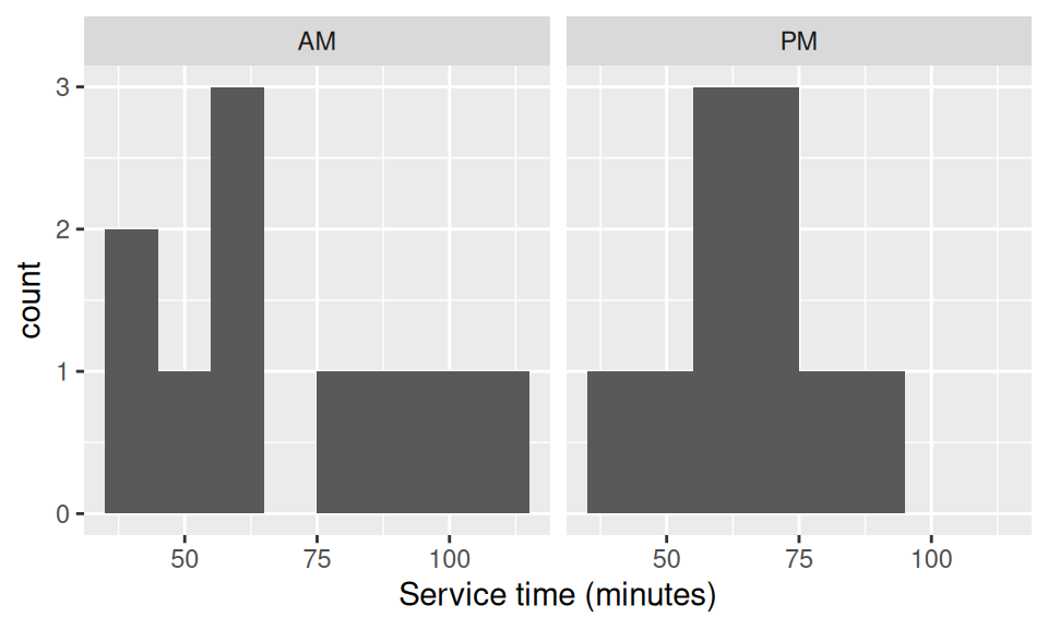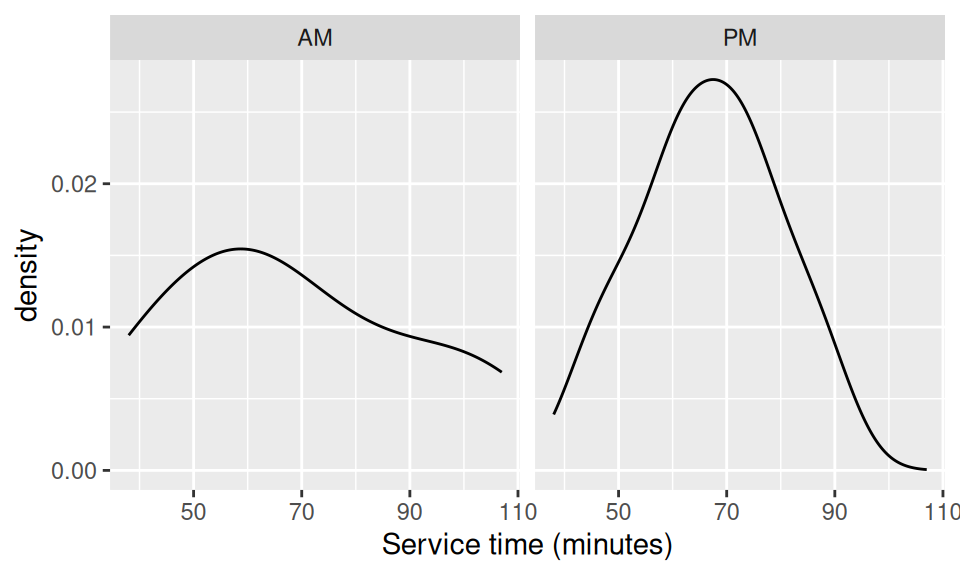 We see that AM service times are, on average, shorter but also more spread out than PM service times.