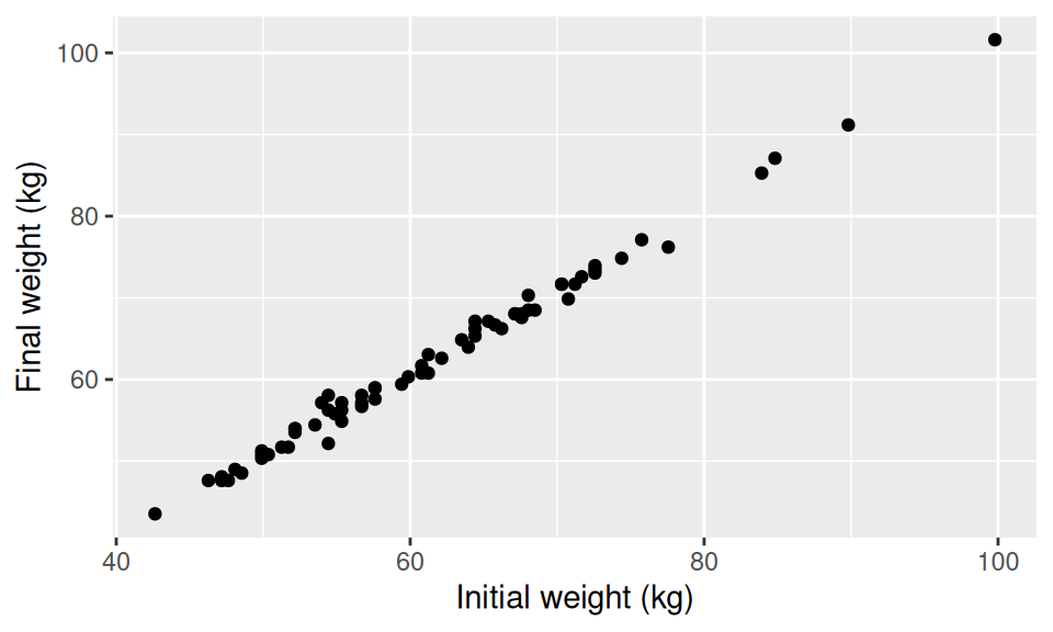 A scatter plot is a good way to look at the relationship between two continuous variables. For example, for the weight data from Example 1.3, we can plot final weights against initial weights: