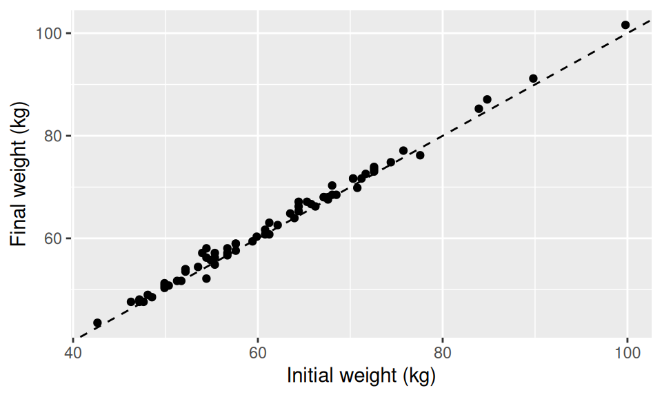 We see that most points lie above the \(y = x\) line, so most students in the sample gained weight during the study, as we saw before. This seems to be true regardless of the student’s initial weight.