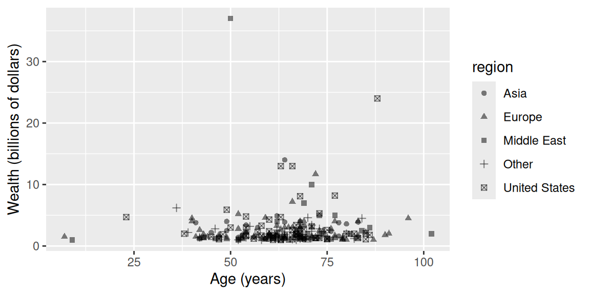 For example, in the billionaires data in Example 1.4, we can plot wealth against age as a scatter plot, using the shape of the points to show different regions: