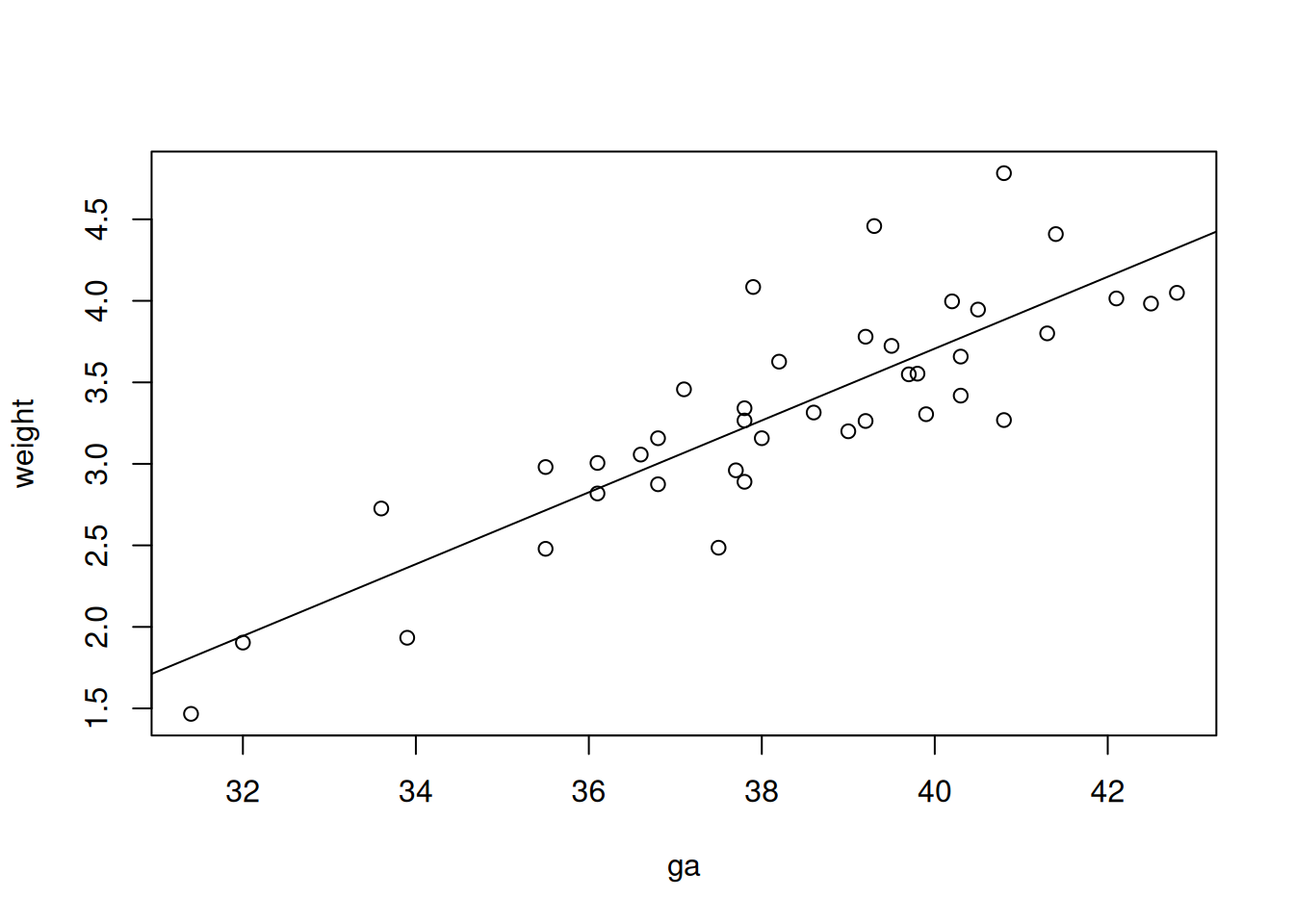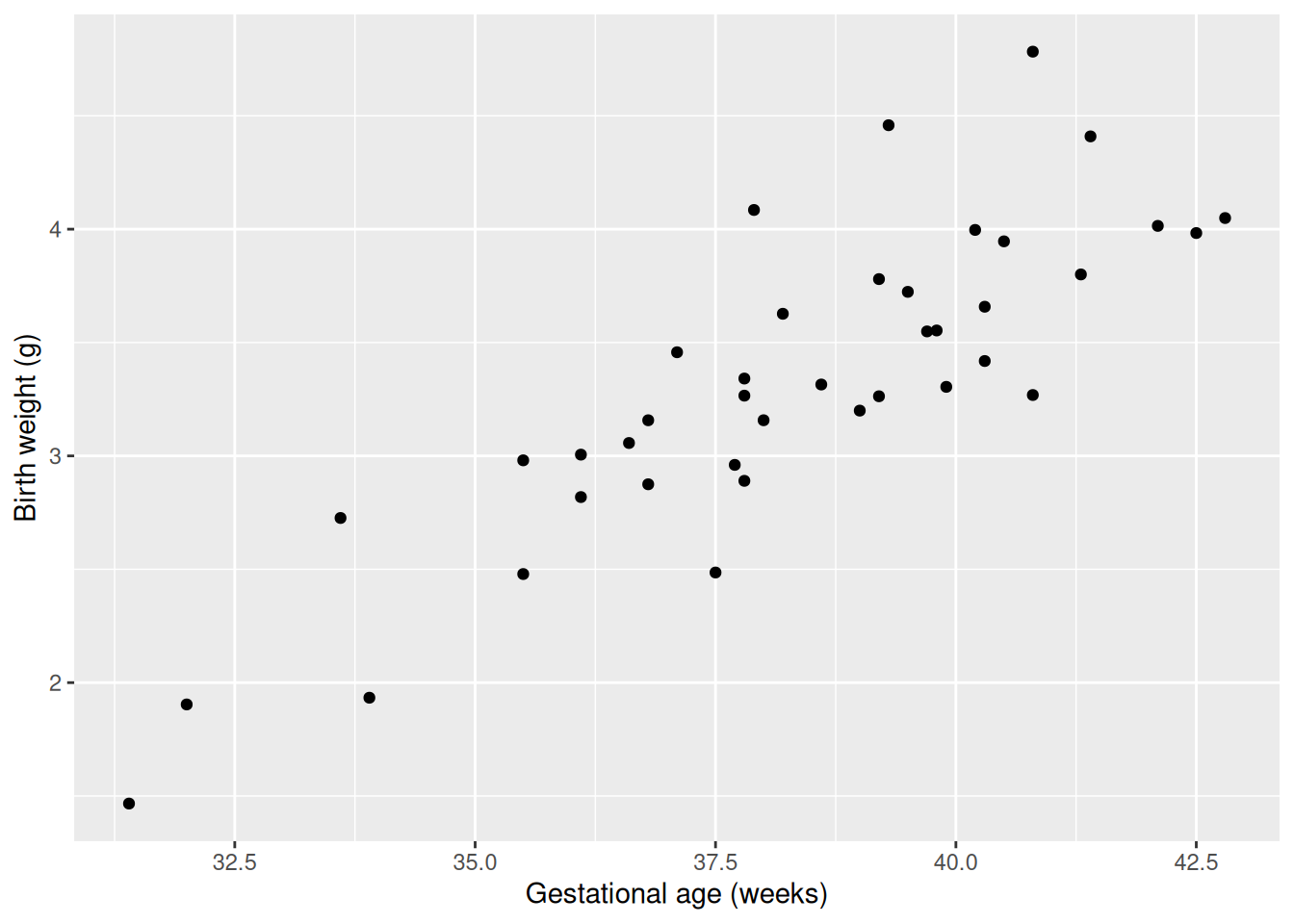 For example, suppose we are interested in how birth weight depends on gestational age (weeks). The response, \(Y\), is birth weight (g). The covariate, \(x\), is gestational age (weeks). Suppose we have the following data (fictional, but based on real data for male singleton births in Canada).