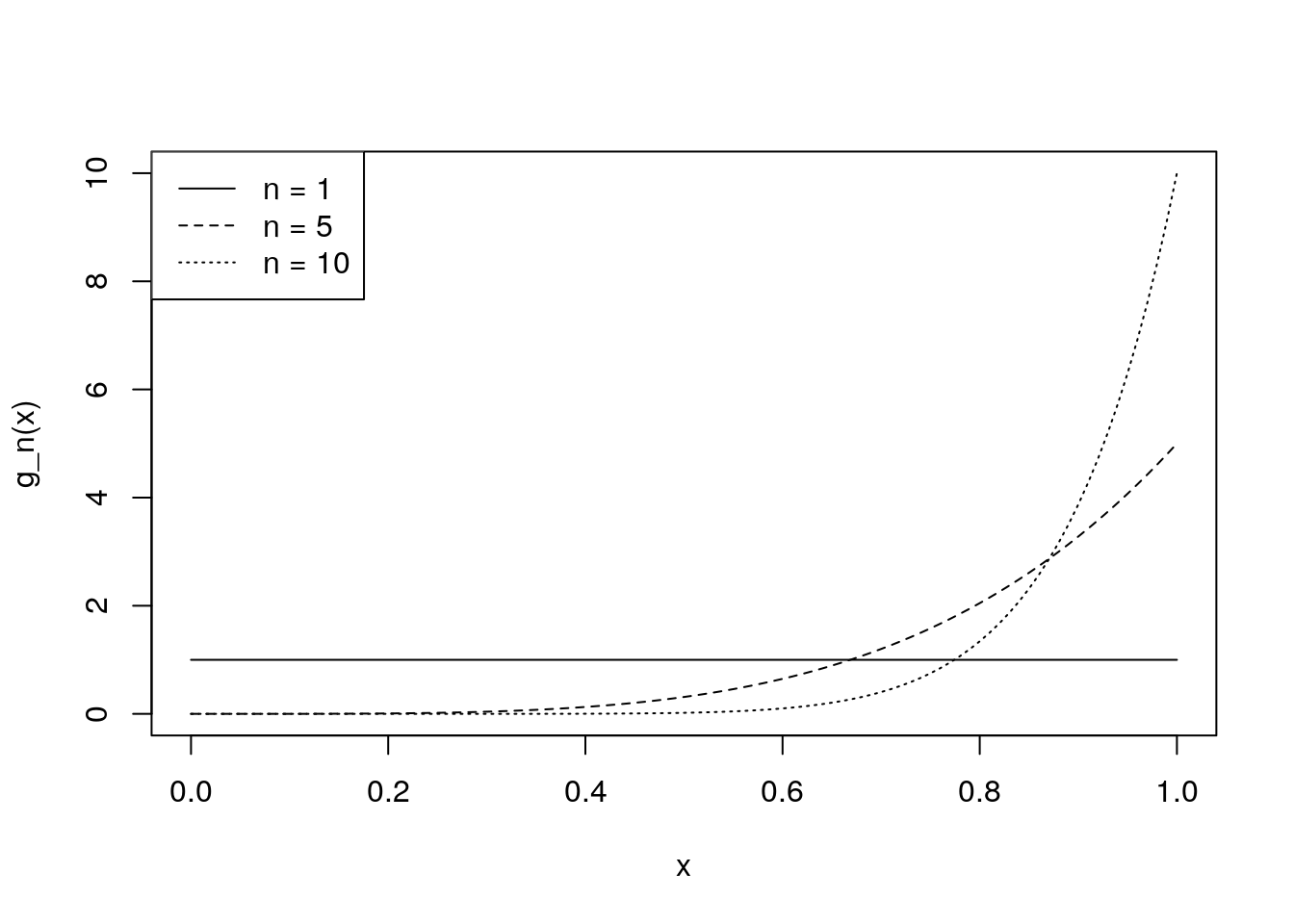 curve(g_n(x, n = 10, theta = 1), from = 0, to = 1, lty = 3,